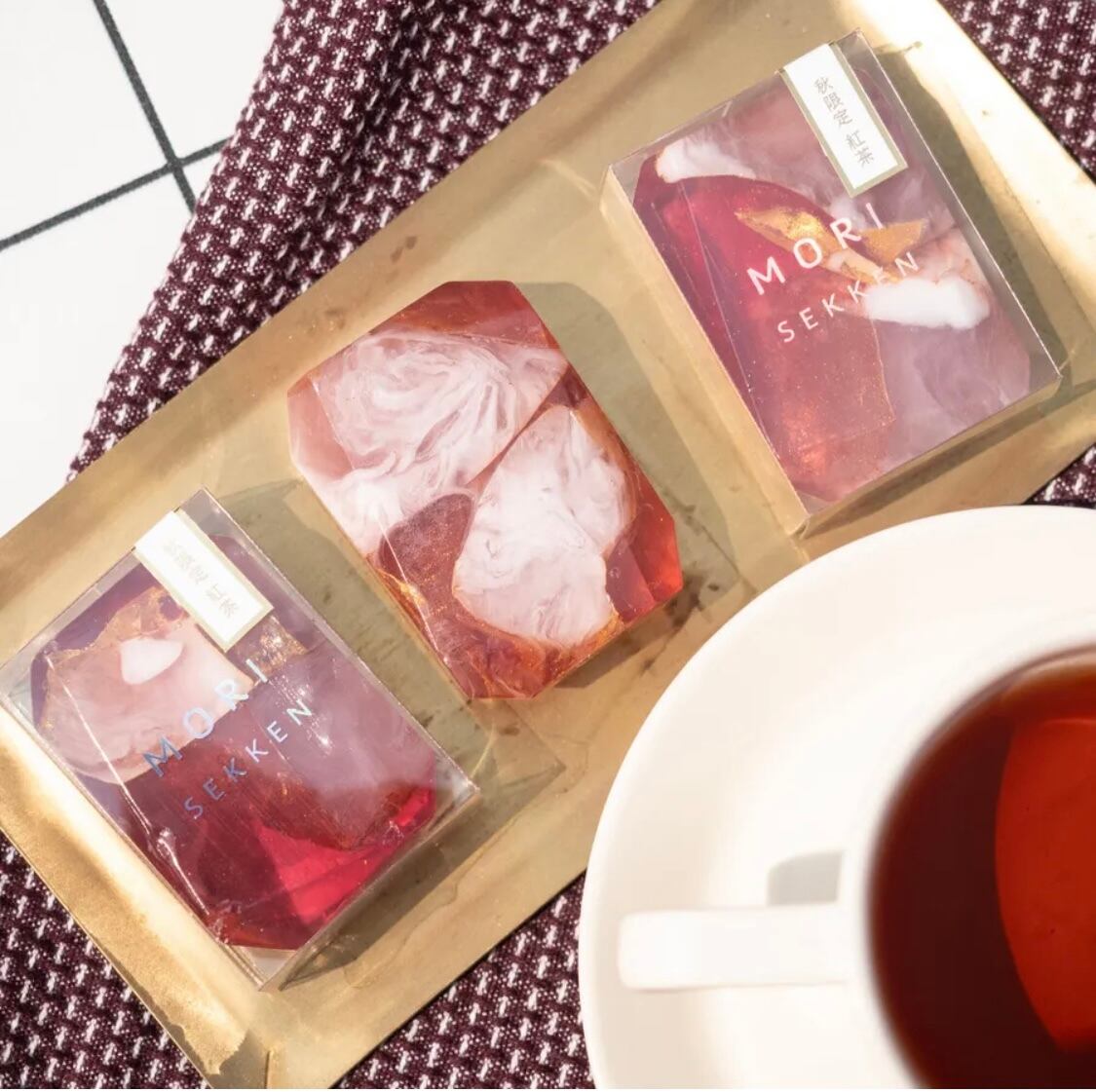 ベルガモットの爽やかさに甘いフローラル、濃厚な紅茶でアフタヌーンティーを思わせる香り。ミルクティーや角砂糖をイメージしたちょっと角張ったマーブルに、紅茶のような赤みの茶色の透明石けんが美しいデザインです。